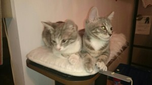 « Bonjour des news de Malibu et Mistigri ! Tout va bien. Malibu reste difficilement approchable, sauf au réveil de ses siestes ! Mistigri se laisse prendre et faire des calins par les enfants. Elle est très douce. Sinon, ils passent leur journée à faire les foufous et ont adopté le tiroir à casserole comme petit nid ! »