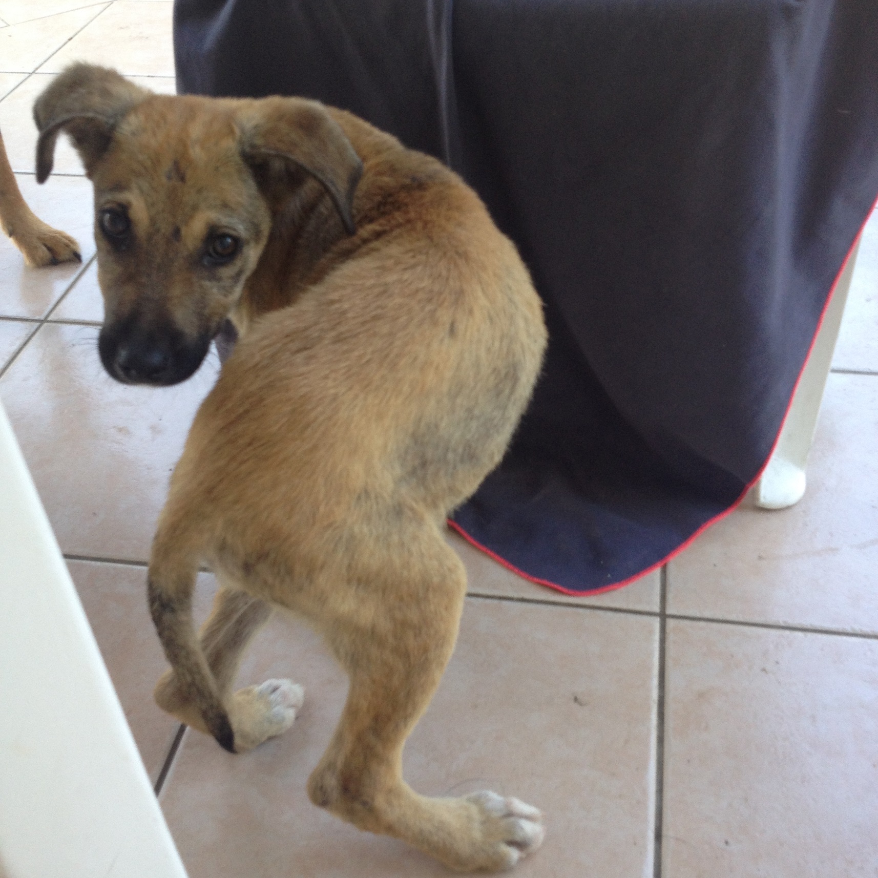 Caractère et histoire : Molkky est un chiot mâle qui pèse actuellement 8 kg (futur gabarit environ 12-15 kg). Il a été trouvé un matin, balancé dans un jardin (ile de La Réunion). Molkky est en cours de traitement pour une gale, mais il a déjà énormément changé et n’est plus contagieux ! C’est un adorable loulou câlin et joueur !