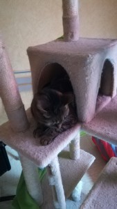 Daisy Belle a bon appétit ! Et elle réclame si sa gamelle est vide. A son arrivée dans sa famille d’accueil, elle se cachait. Maintenant, elle habite l’arbre à chats.