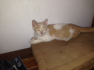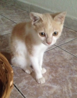 Balou est un chaton mâle beige et blanc avec des yeux jaunes tout ronds et le bout de la queue cassée (en tire-bouchon). Il était un peu plus craintif que sa sœur mais s’est vite rattrapé ! C’est un petit amour, calme et câlin. Balou est gourmand et tranquille, il observe. Il n’a encore jamais miaulé.