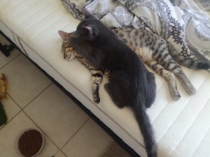Il adore se mettre à côté de sa tata quand elle cuisine, ou fait la vaisselle, et il regarde ce que elle fait, tout en quémandant des câlins (ou piquer des courgettes). Il adore se mettre sur le dos, il s’étire et il attend qu’on lui fasse plein de câlin sur son ventre. En bref, c’est un amour de chaton !