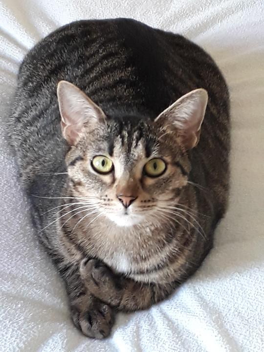 Elle est devenue très câline et affectueuse, elle ne montre pas de signe d’agressivité avec les autres animaux de la famille (chat et chiens). Ses petits étant toujours après elle, elle réclame les bras pour avoir un peu de tranquillité et se love contre l’épaule. Elle n’est pas très joueuse pour le moment, elle est propre.