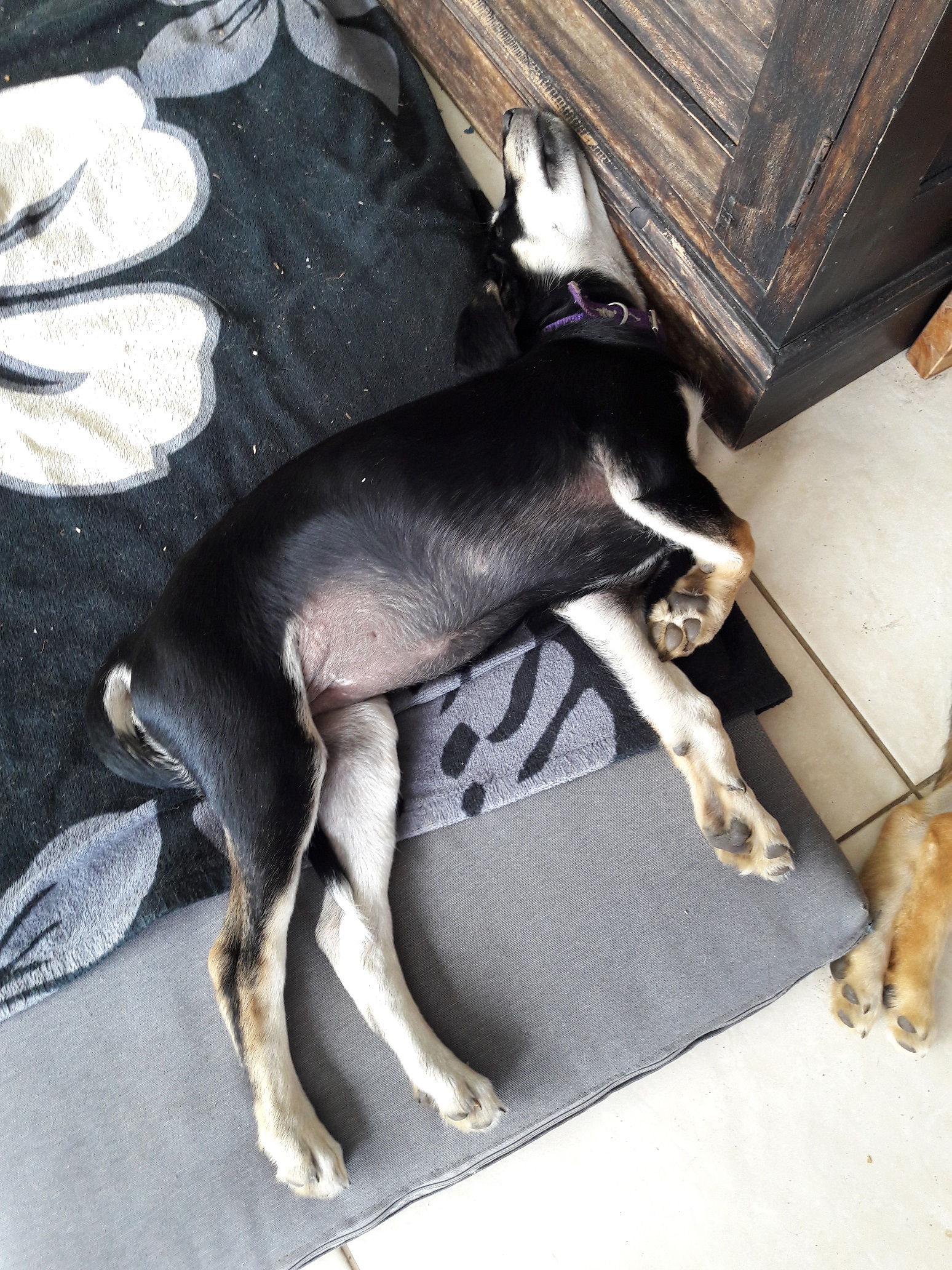 A la maison, elle dort beaucoup et joue avec sa sœur. Elle n’est jamais seule longtemps. Elle traîne dans nos jambes dès qu’on fait à manger. Elle se couche souvent près de nous mais pas forcément. Elle aime bien le canapé mais on ne la laisse pas faire car elle n’aura peut-être pas le droit plus tard. Elle peut passer une soirée à dormir sur le lit collée à vous mais finit par s’isoler pour le reste de la nuit pour revenir chercher des câlins dès qu’elle entend que nous sommes réveillés, ou va venir les réclamer si on met trop de temps à se lever. Le lit, comme le canapé, restent occasionnels. Elle se réveille avec le soleil donc tôt.
