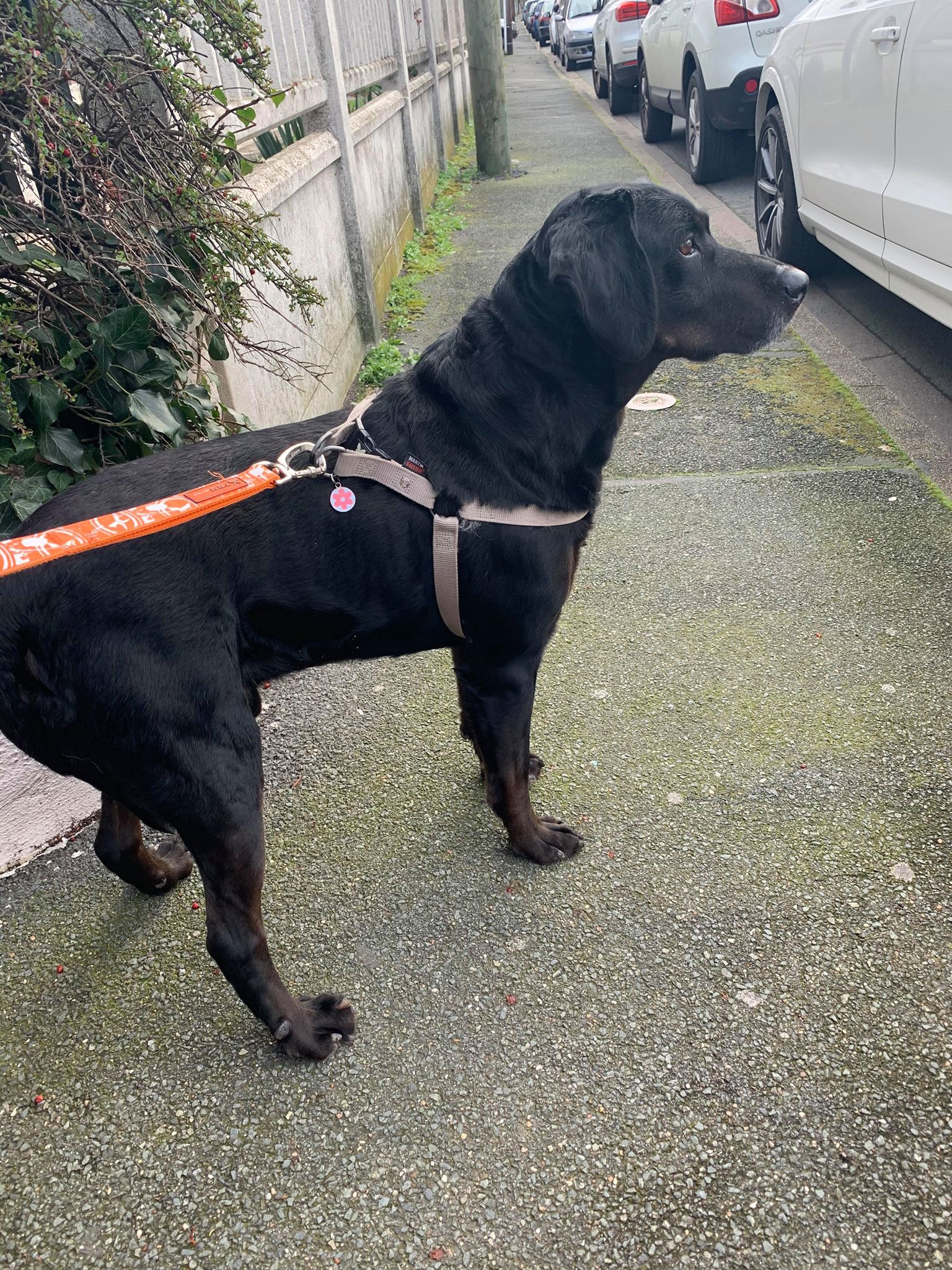 En balade, il tire un peu partout (et il a vraiment de la force), entre stress et excitation. C’est un chien qui ne pourra pas être baladé sans laisse avant très longtemps, si ce n’est jamais.