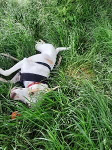 Wifi a du mal à se promener avec la chaleur actuelle. Il se met très souvent sur le bas côté, s’allonge avec sa balle en la mordillant et repart lorsqu’il a moins chaud. Lorsque les températures sont plus clémentes, Wifi marche vite, saute et court dans tous les sens.