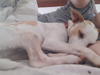 Comportement : A cause de son passé, Wifi est un chien anxieux mais qui reprend rapidement confiance envers l’homme. Il fait une confiance aveugle à sa famille d’accueil et se réfugie contre elle lorsqu’il a peur. Les caresses peuvent être un moment stressant pour Wifi, surtout de la part des inconnus. Dorénavant, sa tata peut le caresser partout sans qu’il n’angoisse ! Récemment, il s’est même jeté dans les bras d’un inconnu pour lui faire un câlin ! C’est un chien loyal, jovial, qui angoisse encore un peu avec des inconnus ou lorsqu’il est entouré par trop de personnes et de chiens (en progrès cependant). Lorsqu’il accorde sa confiance à sa famille, c’est beaucoup plus simple pour lui de s’apaiser.