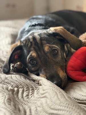 Amande adore jouer avec ses sœurs et son frère. Elle vit aussi avec le chien de la famille sans problème.