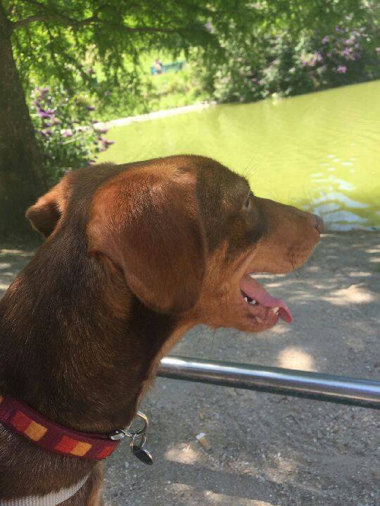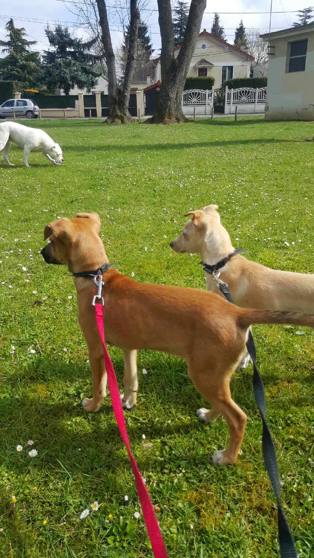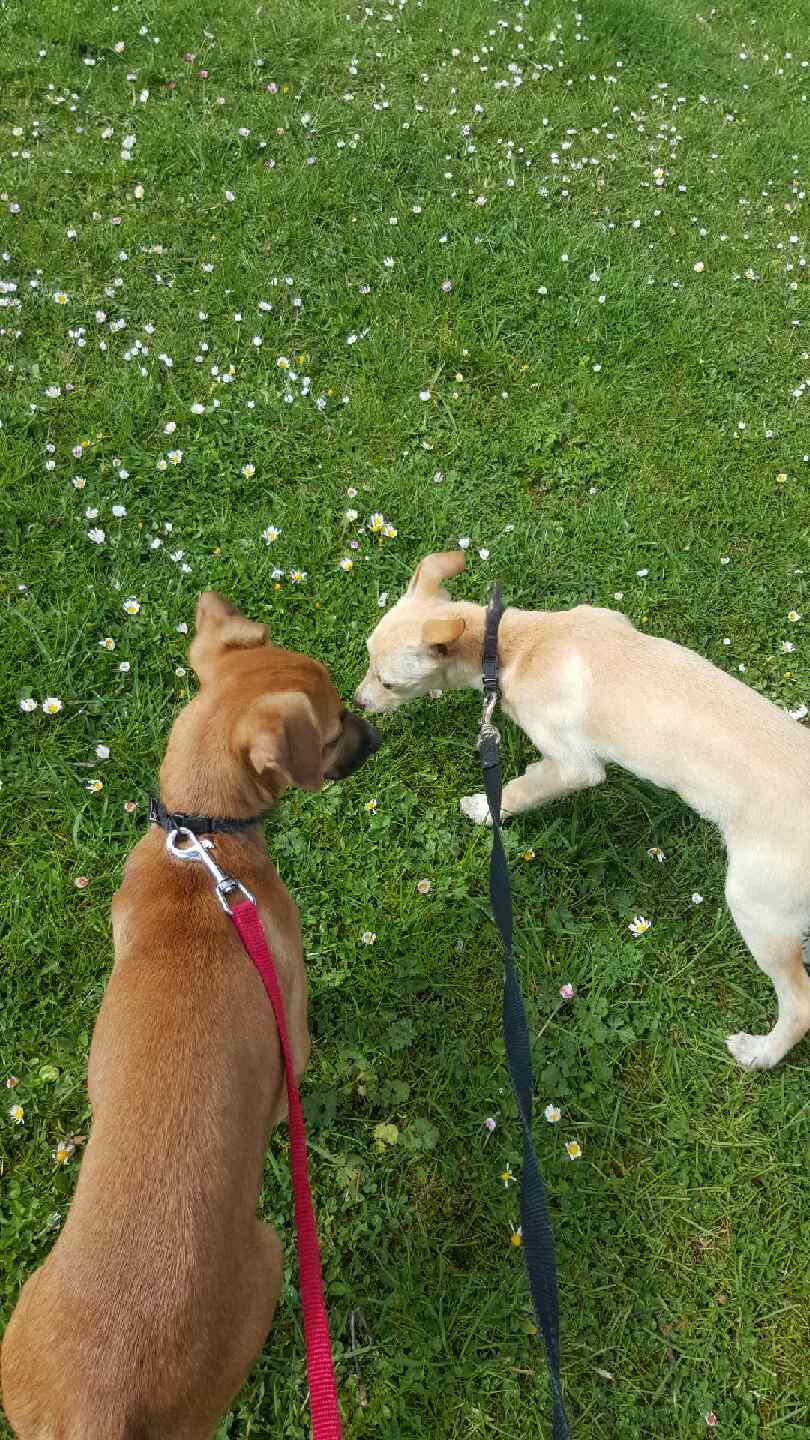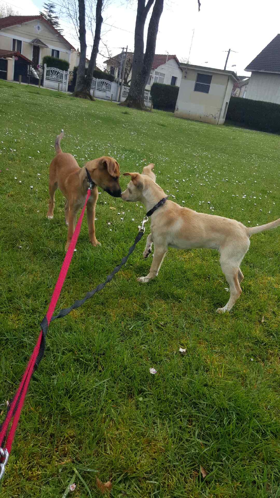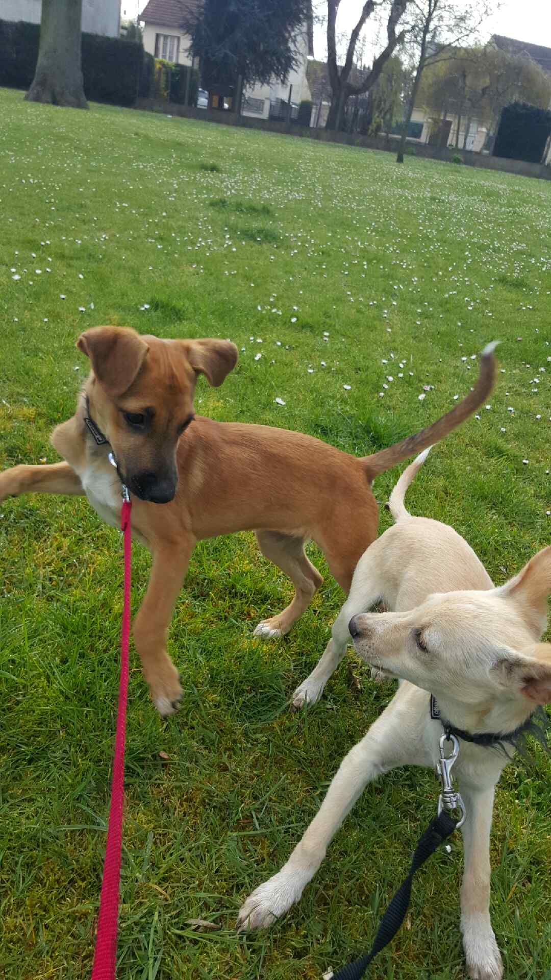 Voici Poupette et Bouénie lors de leur 1ère balade en métropole : « Jeux et découverte en métropole, c’est pas mal quand même ! Merci Rêves de Chiens ! »