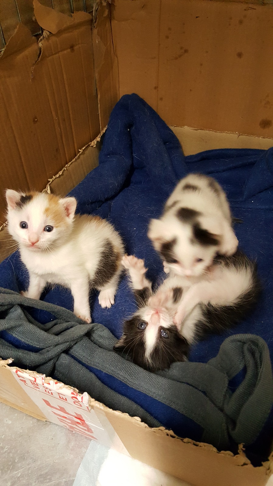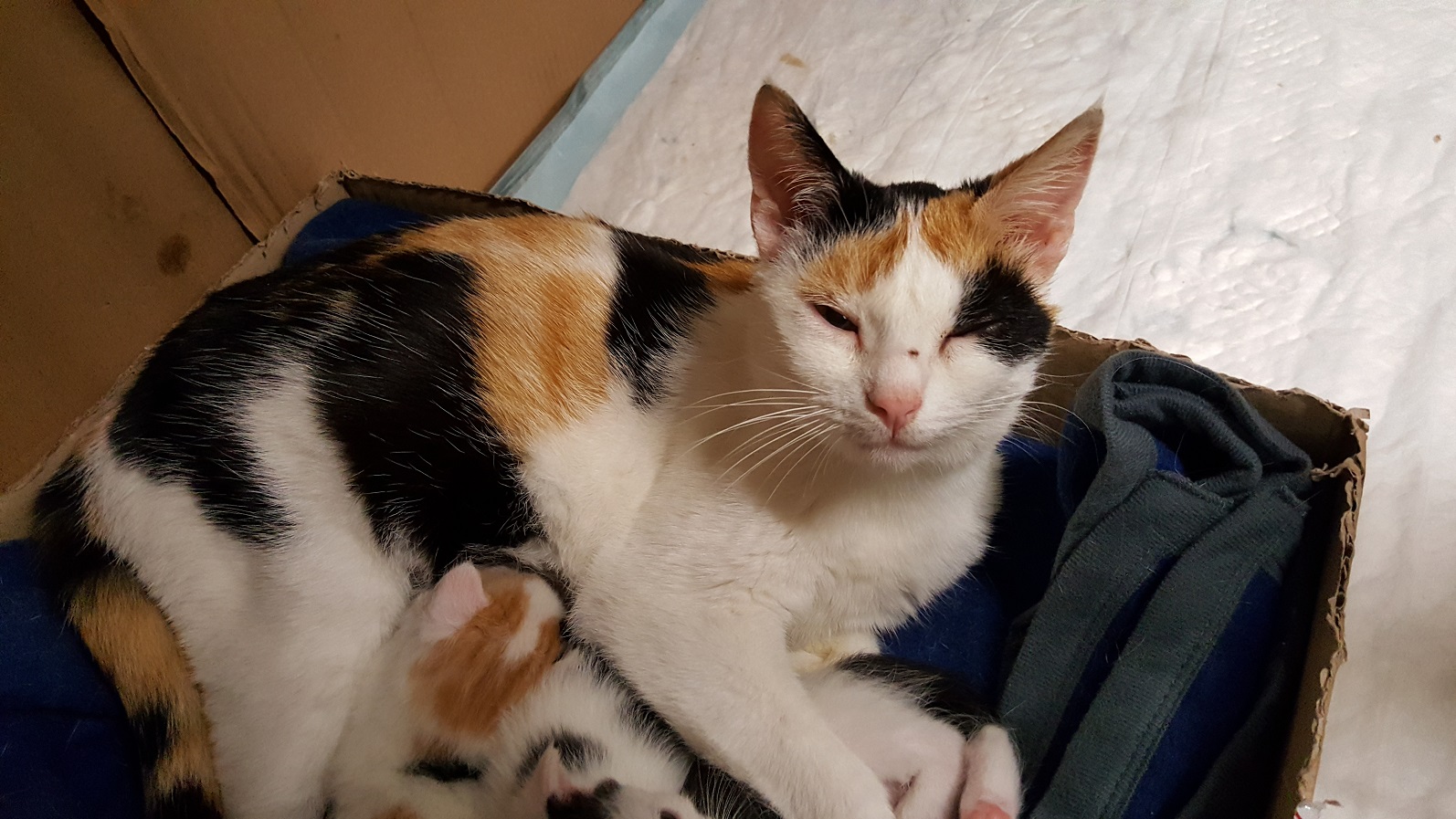 Une belle petite famille est arrivée à l’association ce jour : une adorable minette avec ses 5 chatons tout juste nés. La minette a été trouvée dans une poubelle. Elle a mit au monde ses petits (3 femelles et 2 mâles) 24 heures après avoir été trouvée.